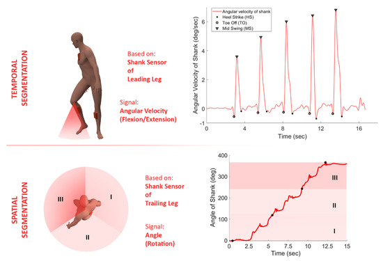 The shank sensors were considered for segmenting the data due to having wider maximal-minimal deviations, which increases segmentation accuracy. Among the two available sensors placed on participants’ leading and trailing legs, the sensor placed on the leading leg was selected for temporal processing. The sensor placed on the trailing leg was considered for spatial segmentation. This stemmed from the fact that a stroke survivor would select the unaffected leg as the leading leg while selecting the direction of turning. Thus, being in the affected region, the trailing leg did not show a clear pattern that could be used for effective temporal segmentation. However, in contrast to temporal segmentation, spatial segmentation offers independence from patterns in the movement and could be implemented to analyze the trailing leg’s movement.