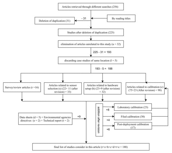This study is conducted based on the articles obtained through scientific databases of google scholar, IEEE explorer, Scopus, Web of Science and ACM digital library. The search has been done using the combination of keywords: low-cost sensors, air quality monitoring, calibration, applications, air quality setup. We considered articles that are available on or before 30 April 2021. We collected a total of 256 studies through the above mentioned searches. In the initial filtering, we eliminated duplicate articles obtained through different searches. The number of articles left after this filtering is 203.