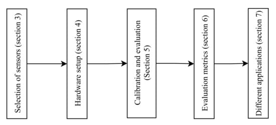 Road-map: Section 2 explains the overall framework briefly and, in the subsequent sections, we will discuss each step in detail. In Section 3, we illustrate how to select LCS for a particular pollutant. Hardware establishment procedure is available in Section 4. Section 5 deals with calibration and evaluation. Section 6 describes different metrics to understand the performance of low-cost sensors. Various applications of LCS are covered in Section 7. Conclusions & future scope are presented in Section 8. Figure 2 illustrates the flow of this study.