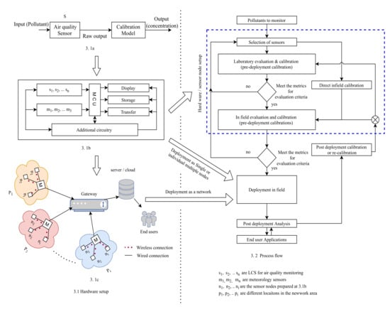 LCS based air pollution measurement framework. 3.1 Hardware setup; 3.1a block box representation of LCS; 3.1b Sensor node/box setup; 3.1c typical sensors network; 3.2 process flow.