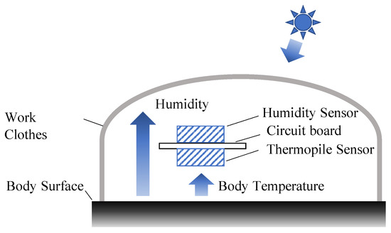 For this reason, we developed a pHST meter that can measure the perceived temperature while reflecting the heat environment, clothing, and body size, as shown in Figure 1. The principle of the pHST index is illustrated in Figure 2. The pHST index consists of a thermopile sensor on the circuit board and another humidity sensor on the opposite side. The thermopile measures the radiant heat emitted from the body surface in a non-contact manner, and the humidity sensor measures the humidity inside the clothes. As shown in Equation (1), the WBGT is calculated by the wet-bulb temperature (degree), black-bulb temperature (degree), and dry-bulb temperature (degree) [1]: