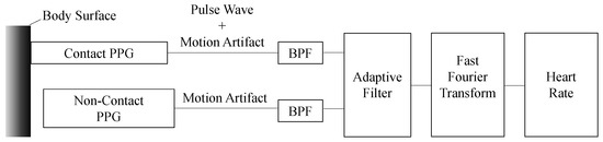 It is well known that vital data can be collected through wireless communication technologies [19]. In particular, real-time heart rate monitoring is important because heart rate increases sharply to exercise and an increase in external temperature. Additionally, tachycardia accompanies a moderate heat stroke [20] therefore, heart rate is useful for accurately preventing heat stroke. However, due to motion artifacts (MA) caused by body movement, it is difficult to precisely measure the heart rate when a person is working. To accurately measure the heart rate of workers, we previously developed a heart rate detection system with effective body motion artifact cancellation [21,22]. Figure 3 shows the principle of the MA cancellation; two pulse wave meters are placed in close proximity to each other, with one pulse wave meter directly touching the skin, and used as a normal heart rate monitor based on photoplethysmography (PPG) (here, this pulse wave meter is called the PPG sensor). The other is placed floating from the skin to detect MA (herein called the MA sensor). In the absence of body movement (i.e., during rest), we can measure the pulse wave waveform without MA noise at the PPG sensor. On the other hand, in the case of body movement (i.e., during exercise and working), the pulse wave superimposed by the MA noise is observed at the PPG sensor however, the MA sensor can detect only the MA noise. A recursive adaptive filter is applied to extract only the pulse wave based on the difference between the data measured by the PPG and MA sensors, so that the heart rate can be accurately obtained even during exercise and working.