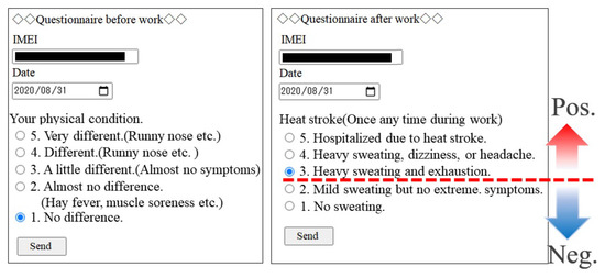 Figure 4 shows the input form of the web survey for the developed automatic annotation. The web survey was conducted before and after working, and the measured vital data was automatically annotated to the degree of heat stroke based on the answers in the web survey. In the developed system, we set a border line to prevent heat stress at the 3rd answer in the after-work web survey. Selection below the 3rd answer denotes the non-heat stroke group (negative), whereas the group that chooses the 3rd answer or higher is labeled as the heat stroke group (positive).