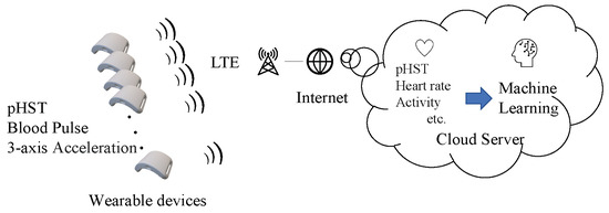 Figure 5 and Figure 6 show an overview of the developed wearable device and vital data gathering system, respectively. As shown in Figure 5, the developed device consists of a PPG sensor, MA sensor (non-contact PPG sensor), three-axis accelerometer, thermopile, and humidity sensors. The heart rate and activity amount were measured at a sampling rate of , whereas the body surface temperature, humidity, and temperature inside the clothes were acquired at a sampling frequency of . All measurement data are stored in the random access memory (RAM) of the wearable device for and then sent to a cloud server via the long-term evolution (LTE) connection illustrated in Figure 6. The supervised machine learning-based system performs heat stroke prediction in the cloud server. Table 1 summarizes the detailed specifications of the hardware configurations.