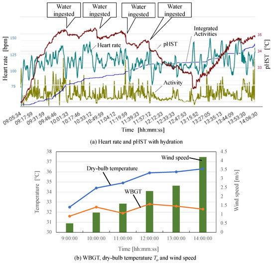 As a measurement example, we demonstrate the time series of the measured biometric data, environmental temperatures, and wind speed in Figure 7. As can be seen from Figure 7a,b, the pHST was not consistent with the WBGT. This is because the WBGT reflects environmental heat stress, on the other hand, the pHST depends on microenvironment heat. Furthermore, it was confirmed that drinking water had a good effect on the heart rate and pHST. The data collecting server converts the measured vital data to into the pHST, heart rate (HR), activity amount, integrated value of each pHST (Int. pHST), integrated value of each heart rate (Int. HR), and integrated value of each activity amount (Int. activity), which are stored in the database in the cloud server and further converted to feature values for supervised machine learning.