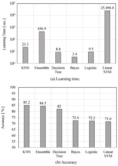 To select a classifier for supervised machine learning-based heat stroke prevention, we used six-dimensional features: The pHST, HR, activity amount, Int. pHST, Int. HR, and Int. activity. Candidates for the classifiers are k-nearest neighbor (KNN, with Euclidean distance), decision tree (maximum number of partitions ), ensemble algorithm (Adaboost, maximum number of partitions ), logistic regression, Bayes (Naive Bayes with Gaussian distribution), and linear support vector machine (SVM). To avoid overtraining, we employed a 10-segment cross-validation. In the experiment, we investigated an optimal classifier in terms of not only the accuracy but also the learning time. The reason for considering the learning time for classifier selection is to suppress the computational cost of the learning model, which should be updated every day to cope with sudden changes in climate such as extreme weather and early summer.