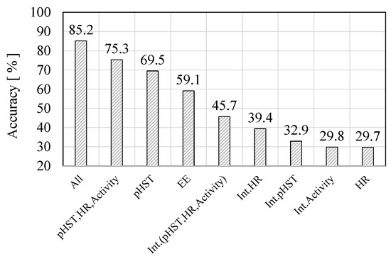 On the other hand, the number of days when pHST reached or higher was 12. The heat strain indication results via the web survey match 10 out of 12, suggesting our proposed pHST index is a good indicator for heat stroke prevention in a heat specific working place thanks to effective measurement of the perceived temperature. The effectiveness of the pHST is also shown in Figure 9; considering only a one-dimensional feature, the pHST achieved the best accuracy of 69.5% for all features. The activity amount reached the second highest accuracy, and the accuracy with HR was the lowest. This is because the most significant factors for heat stroke are the temperature of each individual worker and the activity amount. While working in a hot occupational place, the direct causes of heat stroke are the temperature and activity but HR remains an indirect cause. As a result, when using a combination of all the features, the accuracy becomes the highest, as shown in Figure 9. Furthermore, the integrated values of the pHST, HR, and activity amount are also important information because even a small amount of heat accumulates for a long time.