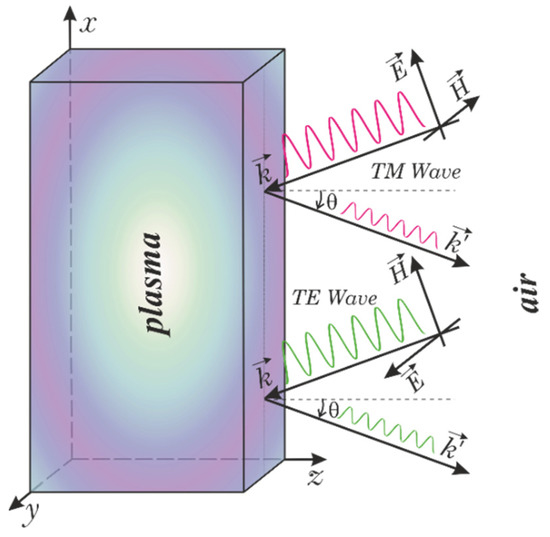 Preliminary calculations [12] have shown that by changing the angle of incidence of electromagnetic waves on the plasma surface, one can reduce the transmission of radio signals through the tunnel communication channel by almost an order of magnitude. Here, we plan to discuss the possibility to obtain a more stable signal for different angles of incidence. Let us consider the oblique incidence of the electromagnetic wave on the vehicle surface. In this case, one can distinguish two types of electromagnetic waves: transverse electric (TE), when the electric field vector is parallel to the vehicle surface covered by the plasma sheath, and transverse magnetic (TM), when the same is valid for the magnetic field vector (see Figure 1). Definitely, for the normal wave incidence, the results for these two cases coincide with each other.