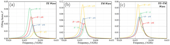 The obtained data for the filling factor in dependence on near one of the resonances are presented in Figure 2. First, it can be seen that for considered dielectric parameters, the resonance shifting is rather small (within the resonance bandwidth). Further, the decreasing of its maximum value is observed. The last circumstance appears due to the decrease of the normal component of the incoming electromagnetic wave flux. As a result, the greater the angle of incidence, the greater the resonance shifting (see Equation (6)). Nevertheless, the dielectric layer with a high value of permittivity plays the role of a «stabilizer», preventing significant displacement of resonant peaks. For εd = 700, which is within the range of particular interest for the problem under discussion, the resonance shifting is negligible. For almost any angle of incidence, the wave in the resonator propagates nearly normally to the vehicle surface. Comparing data in Figure 2a,b one can notice that, unlike the TE wave, the filling factor for the TM wave grows slightly with an angle increase, and the resonant position shifts slightly to the left. In particular, this effect is associated with the direction of the electric field strength vector. Due to the presence of the E-field component normal to the surface, the TM wave interacts more efficiently with the plasma layer. As a result, better signal tunneling is observed near the resonance frequency region. From a practical point of view, both the angle of incidence and the contribution of the TE and TM components can be varied during the signal transferring to the vehicle. This means that the filling factor should be calculated for mixed polarization. It is important to notice that for the case of mixed polarization, the differences between the TE and TM cases partially compensate each other: for the case of the equal contribution of both polarizations (such a case corresponds to the unpolarized GHz pulse), the data presented in Figure 2c demonstrate a very weak filling factor dependence on the angle of wave incidence.
