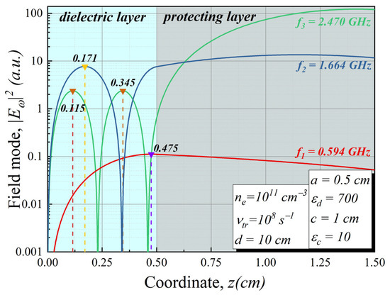 As the first step, we investigated field modes inside the dielectric layer without a metal layer. For the given parameters of the structure, there were three eigen-frequencies in the resonator below the plasma frequency. It can be seen that due to a wide protecting layer, the distribution of the field in the modes behaves as if in a shallow well of width a. Further, we mainly analyze the tunneling channel at the frequency of the third mode of the resonator (f = 2.47 GHz). In this case, the electromagnetic field packet passing through the plasma undergoes the fastest decay [14].