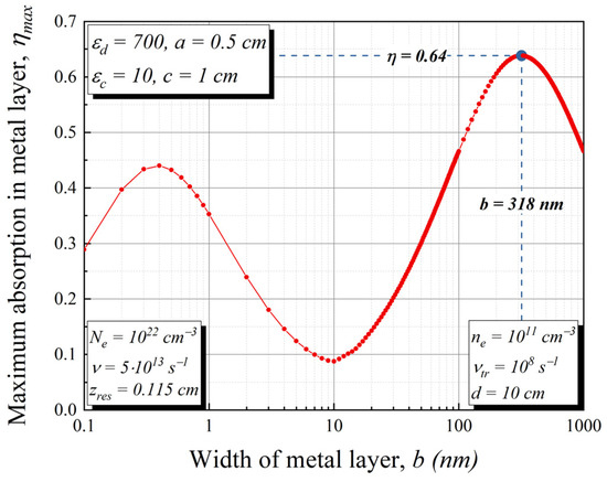 Dependence of maximum absorption η in the metal layer on the width of this metal layer b. The parameters are a = 0.5 cm, εd = 700, cm, c = 1 cm, εc = 10, d = 10 cm.