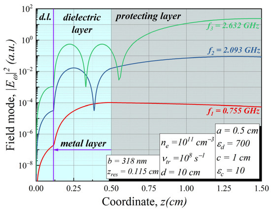Modes distribution inside the considered Figure 3 structure. Different colors schematically illustrate the structure’s layers. Parameters used: a = 0.5 cm, εd = 700, b = 318 nm, zres = 0.115 cm, c = 1 cm, εc = 10, d = 10 cm.
