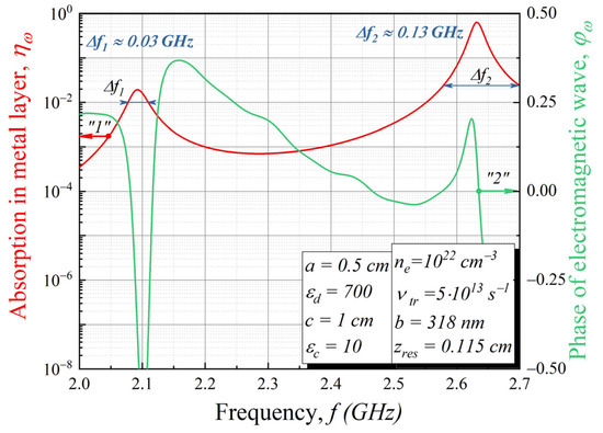There are two peaks of absorption in the frequency range 2.0 GHz–2.7 GHz (2.7 GHz ≈ (2π)−1ωp). The first peak is rather small (ηω ≈ 0.02) with central frequency 2.093 GHz. The second peak has ηω ≈ 0.64 with a central frequency 2.632 GHz and Δf2 = 130 MHz on the level of absorption of 0.025. The absorption scale was graduated from to 1, where the ground level corresponds to the case when there is almost no absorption of the external electric field in the metal layer, and “level 1” corresponds to the full absorption of the external electric field. Therefore, up to 64% of an external wave field can be absorbed at the carrier frequency ~2.6 GHz.