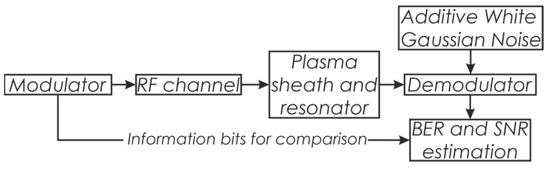The plasma sheath and resonator distort the radio signal due to the absorption of signal energy in certain frequency ranges. The amplitude–frequency and phase–frequency response curves of the “plasma + resonator” system are depicted in Figure 7. It is seen that the system’s frequency response is quite uneven. The matched filter was designed as a finite impulse response (FIR) filter with tap coefficients representing a complex-conjugate impulse response of the “plasma + resonator” system. The numerical simulation of the radio signal reception via the proposed resonator was conducted using the scheme depicted in Figure 8. An RF channel was implemented as signal attenuation due to energy loss in the atmosphere. Signal energy loss was calculated using the ITU-R P.618-13 recommendation taking into account the loss caused by signal propagation in the atmosphere, the influence of clouds, and precipitation for the 2.632 GHz operating frequency. The considered system, consisting of the plasma sheath and resonator, was implemented as the FIR filter with tap coefficients representing the impulse response of the “plasma + resonator” system. The modulator was designed to form a binary shift-keying (BPSK) signal with a direct sequence spread spectrum (DSSS).