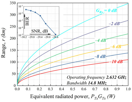 According to ITU-R P.618-13, the average atmospheric loss for the 2.632 GHz operating frequency is about 3 dB. However, more than 3 dB will be lost due to the imperfect synchronization scheme operation and Doppler effect compensation according to the navigation system data. The calculations lead us to the curves of the maximum communication range depending on the equivalent radiated power PTx GTx, where GTx is gain of the transmitting antenna and PTx is radiated power. These curves are depicted in Figure 9. Each curve represents a given receiving antenna gain GRx.
