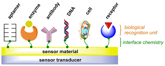This review article deals with current developments in the field of AAS determination, with the main emphasis on methods utilizing antibodies, enzymes, aptamers, oligonucleotides, cells, their receptors, and, last but not least, chemically designed artificial sensors. A schematic diagram of a biosensor is depicted in Figure 1. Since it is difficult to unambiguously classify methods for AAS determination due to the multidisciplinary character of some of them, the discussed approaches are divided mainly according to the nature of the recognition structures concerning the physical principles of the conversion of the measured quantity to the signal value.