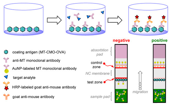 A diagram depicting the principle of indirect competitive enzyme-linked immunosorbent assay (ELISA) and the composition of an immunochromatographic test. NC: nitrocellulose; MT: methyltestosterone; MT-CMO-OVA: a conjugate of methyltestosterone-3-carboxymethyloxime with ovalbumin; mAb: mouse-derived antibody against MT; HRP: horseradish peroxidase [91].