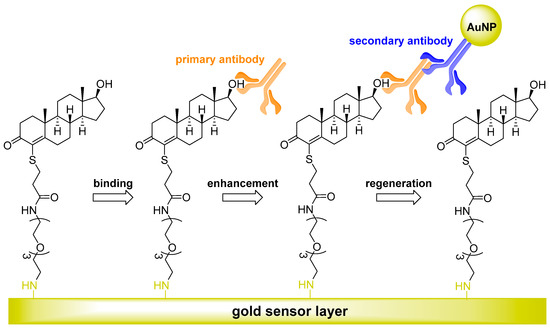 A diagram depicting the principle of a binding process in a surface plasmon resonance (SPR) immunosensor assay with nanogold labeling. An amino-terminated oligo(ethylene glycol)-linked testosterone conjugate was synthesized and immobilized on an SPR biosensor. The immunosensor system for testosterone utilized both secondary antibody and gold nanoparticle (AuNP) signal enhancement. The mechanism for the increased sensitivity resulted from increased binding mass and an Au–plasmon coupling effect. The addition of a secondary antibody with an attached AuNP increased the signal sensitivity of the assay by 12.5-fold compared to the primary antibody alone. The biosensor was stable for more than 330 binding and regeneration cycles [107].