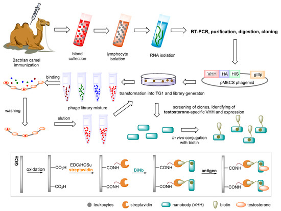 - Li, G.; Zhu, M.; Ma, L.; Yan, J.; Lu, X.; Shen, Y.; Wan, Y. Generation of Small Single Domain Nanobody Binders for Sensitive Detection of Testosterone by Electrochemical Impedance Spectroscopy. ACS Appl. Mater. Interfaces 2016, 8, 13830–13839. [Google Scholar] [CrossRef]