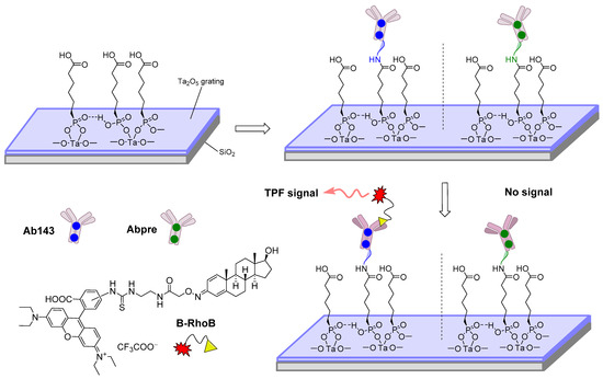 Diagram showing the surface functionalization, covalent immobilization of antibodies (Ab143: specific antibody marked with blue dots, Abpre: non-specific antibody marked with green dots), and the principle of a bioaffinity assay (TPF: two-photon fluorescence emission) using boldenone fluorescently labeled with rhodamine B (B-RhoB) [103].
