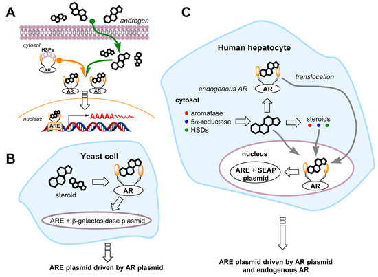 A diagram depicting the androgen response in cells. (A): androgens cross the cell plasma membrane to the cytosol and bind to the androgen receptor (AR). In the cytosol, the AR is held by heat shock proteins (HSPs) and other cofactors. Once androgens are bound to the AR, a conformational change is induced. The AR gets rid of inhibitory factors to form an androgen/AR complex. The complex translocates to the cell nucleus, and the receptor dimerizes and binds to the androgen response elements (AREs) located in the regulatory regions of target genes. When bound to the deoxyribonucleic acid (DNA), the AR enhances gene transcription by the ribonucleic polymerase. Yeast (B) and mammalian (C) cell-based androgen bioassays. The assays are based on the transfection of two plasmid DNAs: The first is the androgen receptor (AR) expression system providing AR expression in cells (yeasts do not express any endogenous ARs, and hepatocytes express them only at a minimal level). The second vector is the ARE-driven reporter gene vector. The most efficient reporter genes are β-galactosidase and secreted alkaline phosphatase (SEAP) in yeast and mammalian cells, respectively. Yeast cells do not express androgen-metabolizing enzymes, while human hepatocytes express a variety of them, including 5α-reductase, aromatase, and hydroxysteroid reductase (HSD) [115].