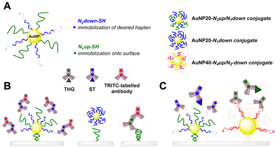 A diagram depicting the composition of multifunctional biohybrid nanoparticles. (A): A nanoparticle (NP) is codified with two different oligonucleotide strands: one for selective functionalization with the corresponding hapten, and the second for immobilization on a DNA microarray. The oligonucleotides are designated as Nx plus the words down or up. The “down” series hybridize with the corresponding hapten–oligonucleotide conjugate with the complementary oligonucleotide sequence. The “up” series hybridize with the complementary oligonucleotide sequence immobilized on the DNA microarray chip for site codification of the gold nanoparticles (AuNPs). AuNP20-N3up/N1down (20 nm-sized NPs) detect stanozolol (ST) with N3upSH, which is complementary to N3downNH2 oligonucleotides immobilized on the chip, and N1down, complementary to the hapten oligonucleotide probe 8-N1up. AuNP20-N1down does not have a chain that hybridizes with the DNA chip. AuNP40-N4up/N2down (40 nm-sized NPs) detect tetrahydrogestrinone (THG) and are biofunctionalized with N4upSH for hybridization with the N4downNH2 chains of the DNA chip, and with N2downSH for hybridization with the hapten oligonucleotide probe hG-N2up). Selectivity of the DNA-directed immobilization of AuNPs is demonstrated by fluorescence immunoassay and the multiplexed localized surface plasmon resonance microarray chip for the determination of ST and THG. (B): the diagram shows the experimental conditions for each case of the oligonucleotide-codified AuNPs, the antibodies used, and the multiplexed LSPR immunosensor chip. (C): specific antibodies bind to their corresponding hapten immobilized on the surface of the chip, or to a free analyte [122].