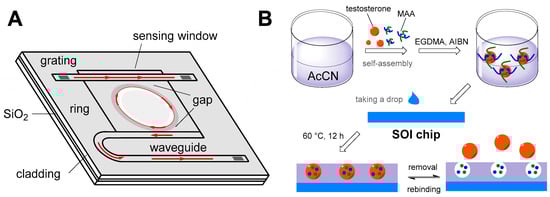 A diagram showing the description of individual parts of a micro-ring resonator sensor (A) and the principle of the preparation of molecularly imprinted polymers on the chip surface (B); AcCN: acetonitrile, MAA: methacrylic acid, EGDMA: ethylene glycol dimethacrylate, AIBN: 2,2′-azobis(2-methylpropionitrile), SOI: silicon-on-insulator wafer) [135].