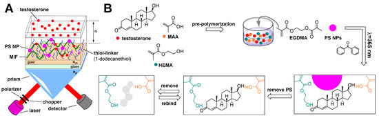 A diagram showing the setup of a surface plasmon resonance sensor (A), the PSNPs (polystyrene nanoparticles)–MIF (molecularly imprinted film)-functionalized sensor, and the schematic procedure of macroporous MIF formation (B). MIF was synthesized by photopolymerization of methacrylic acid (MAA), 2-hydroxyethyl methacrylate (HEMA), ethylene glycol dimethacrylate (EGDMA), and polystyrene nanoparticles (PSNPs) in combination with testosterone template molecules. This MIF-based sensor showed high stability and reproducibility for eight months when stored at room temperature [138].