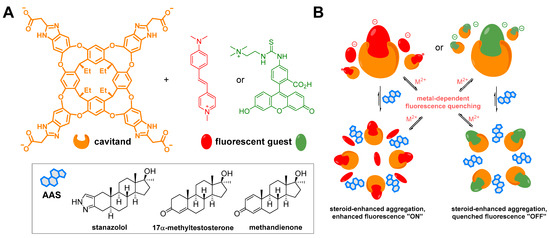A diagram showing the molecular structure of the host (in orange), fluorescent guests (in red, trans-4-[4-(dimethylamino)styryl]-1-methylpyridinium iodide (DSMI), and a fluorescein-based dye in green), and tested anabolic-androgenic steroids (AASs; (A)). Possible aggregation modes of the complexes and the effects of steroid addition on the emission profiles (B). The sensing is triggered by an aggregation mechanism. Aggregation can be mediated by the presence of both metal ions and steroids. Both the “turn-on” and “turn-off” modes of fluorophores are essential for analyte discrimination [127].