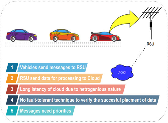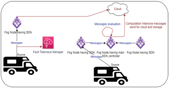 The data generated by SDVN are stored on the cloud for further processing and storage. Cloud computing is defined as “a model for enabling ubiquitous, convenient, on-demand network access to a shared pool of configurable computing resources (e.g., networks, servers, storage, applications, and services) that can be rapidly provisioned and released with minimal management effort or service provider interaction. This cloud model comprises five essential characteristics, three service models, and four deployment models” [7]. We need to use fog computing to reduce response time to store and execute SDVN vehicles’ data. Fog computing minimizes delay, and the servers are placed to nearby edges for the users. Fog computing is defined as “a geographically distributed computing architecture with a resource pool consists of one or more ubiquitously connected heterogeneous devices (including edge devices) at the edge of the network and not exclusively seamlessly backed by cloud services, to collaboratively provide elastic computation, storage and communication (and many other new services and tasks) in isolated environments to a large scale of clients in proximity” [8]. Current models of SDVN performed well, but they are using the cloud for execution and storage, which will increase the response time of critical/priority-based tasks. Furthermore, the main challenge is fault tolerance, as if priority/critical-based tasks fail but the sender is not aware of it, it will create problems for other vehicles in the attached area.