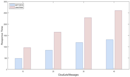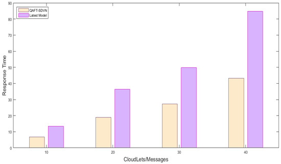 We created one cloud node with a data center; the details are provided in Table 3 and Table 4. Three fog nodes are created with equal specification and placed three SDN nodes in which one was considered as SDN main controller. 15 vehicles randomly sent messages, and we observed their response time using fog nodes and fog nodes. Figure 4 shows the response time comparison of the proposed model with the latest work using fog and without fog nodes. Figure 4 x-axis shows No messages/Cloudlets/Tasks executed, and the y-axis shows response time milliseconds. We sent the first 10 messages to fog and then to cloud, then we sent 20 messages, 30 messages, and 40 messages. Due to fog usage, we reduced the response time of safety messages by up , which is sufficient for vehicles in an emergency. So, the proposed QAFT-SDVN model perfumed very well in terms of response time while forwarding safety messages. The other non-safety messages were sent by FCPS methods whose response time was also reduced by fog nodes. Similarly, as shown in Figure 5, response time comparison non-safety messages are provided, and the results show that our proposed model performed well, as we used fog nodes for SDN technology instead of the cloud.