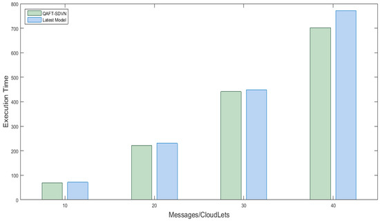 In this scenario, fifteen vehicles were created, one cloud datacenter, three fog nodes placed with SDN nodes. Different messages are created and sent to fog nodes and then to the cloud, and their execution time is analyzed and compared with work already done in [27,28]. Figure 6 x-axis shows no messages from vehicles while the y-axis shows execution time taken by the messages. The execution time of the proposed model and the available work is the same, but our proposed model reduced execution time up to 4% by using efficient priority algorithms to categorize safety and non-safety messages.