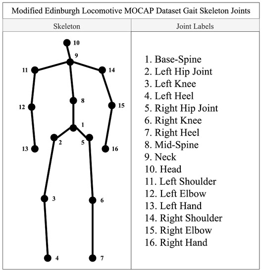This section describes the numerous experiments that were run to tune the hyperparameters of the network as well as to train and test the proposed network. All the experiments discussed in this paper were run with a data split of 80:10:10 for training, validation, and testing using a stratified shuffling on the Edinburgh Locomotion Mocap Dataset (ELMD), which was collected by researchers from the University of Edinburgh [43] and annotated by Bhattacharya et al. [37]. The modified ELMD dataset consists of 1835 gait sequences recorded for 4 s at 60 Hz. Thus, each gait sequence in the dataset has 240 frames. Each gait sequence consists of 48 values which correspond to three coordinates of 16 body joints (see Figure 2 for details). While GER can be performed using gait skeletons with a fewer number of body joints and/or lower dimensional coordinates, having fewer amounts of data points would be detrimental to the network’s performance. These gait sequences were labeled by [37] into four categories of emotions: angry, happy, sad, and neutral. The labels were generated by various participants on a crowd-sourced website that provided ratings to each sequence based on the emotions they perceived from that gait. This resulted in a dataset of 1835 gait sequences, with each sequence consisting of 240 frames and each frame with 16 × 3 values. These 1835 gait sequences consist of 1048 angry gaits, 454 happy gaits, 254 sad gaits, and 79 neutral gaits.
