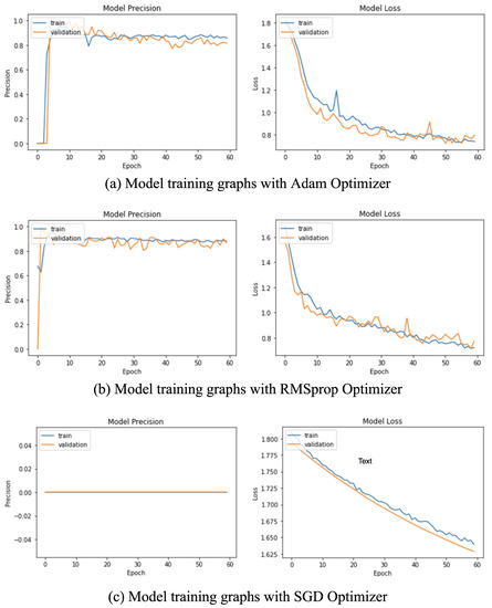 Model training graphs with: (a) Adam optimizer, (b) RMSprop optimizer, and (c) SGD optimizer.