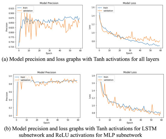 Next, the network was tested using two different activations: and the rectified linear unit (). While using activations in MLP resulted in a faster learning and closer loss curve (see Figure 4), the model could not achieve a high mean average precision (mAP) value on the test set. However, the weights could reach their optimal values using activations in all layers, which is evident from the higher mAP value observed in Table 3. Moreover, using activations for the proposed LSTM sub-network resulted in the dying problem, which occurs when a large number of neurons are zeroed out.