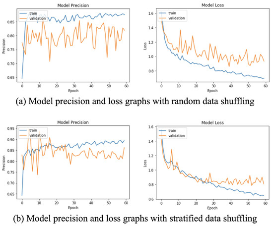 Model training graphs with (a) random and (b) stratified data shuffling. The stratified data shuffling results in less overfitting and a lower model loss. Hence, stratified data shuffling was used.