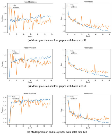 Model training graphs with smaller batch sizes result in unstable learning depicted by the oscillating precision and loss curves. In contrast, larger batch sizes ensure that batches have a good representation of input samples from each class. However, larger batch sizes also cause the learning to regularize too much and worsens the performance of the network. A batch size of 64 provides a balance of smooth learning with a low loss value at the end of the training and was chosen as a model parameter.