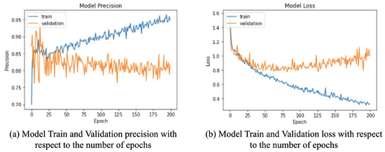 Model precision and loss graphs for the (a) training and (b) validation sets with respect to the number of epochs. The validation loss of the model started to stabilize around epoch 75 and then began to overfit. Additionally, the precision values of the model also started dipping shortly after epoch 75. Hence, the number of epochs to train the model was chosen to 75.