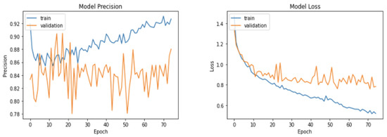 The network was trained using a typical 80:10:10 data split of the ELMD dataset [43] with two types of data shuffling: random and stratified. Using stratified data shuffling resulted in more generalized training, which can be observed as close trends of the training, validation loss, and precision curves in Figure 5. Consequently, this improved the precision score of the model, as shown in Table 5, and hence stratified shuffling was chosen for this model.