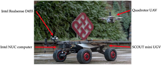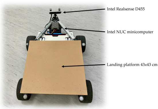 In the experiments, a small Scout Mini (AgileX Robotics, Shenzhen, China) UGV was chosen to be the moving platform of the system. Figure 6 shows the setup of the UGV. An acrylic square pad (43 × 43 cm) was mounted directly on the top of the vehicle, and a set of Intel RealSense D455 stereo cameras (Intel Corporation, Austin, TX, USA) was fixed in front of the landing platform with an upward-facing angle of . The cameras were connected to an Intel NUC minicomputer (NUC8i7BEH, Intel Corporation, USA) for image collecting and processing.