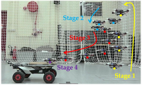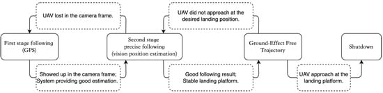 The purpose of this stage is to carry out the approaching maneuver in a smooth and safe trajectory, which generates fewer ground effects compared to landing vertically. A detailed description of the method is described in Section 2.4. When the UAV meets the landing position, the state machine then switches to the last stage. Several failsafe conditions are considered while the UAV is conducting this approaching maneuver: (1) the divergence of the UAV’s position with the desired trajectory; (2) insufficient remaining altitude of the UAV to meet the final approach’s requirement; and (3) the amount of overshoot of the UAV’s position to the landing platform. If any of these criteria are out of bounds, the state machine immediately switches back to the previous stage and rapidly separates the UAV from the landing platform to maintain a safe distance.