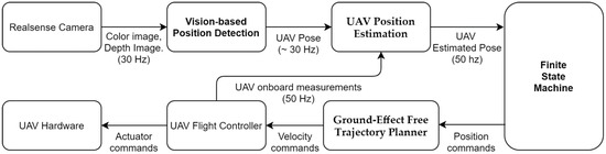 The landing system consists of several modular components, including the following: (1) vision-based position detection, (2) UAV position estimation, (3) a finite state machine, and (4) a ground-effect free trajectory planner. The relationship of each module is presented in Figure 3. This modular framework enables the use of different operating frequencies in independent modules, and can be easily modified or replaced with other algorithms.