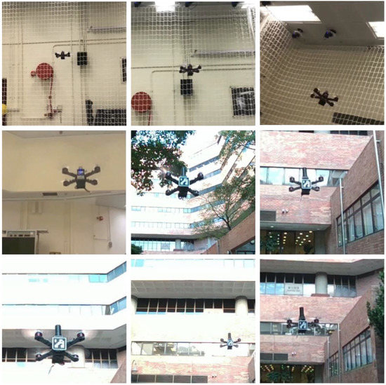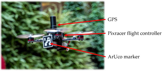Figure 7 shows the UAV applied in the flight tests, which is a typical X-type quadrotor with a diameter of 210 mm. The four motors are EMAX RS2205 (EMAX model, Shenzhen, China) controlled through four T-MOTOR F35A (T-MOTOR, Nanchang, China) Electronic Speed Controllers (ESC). The ESCs are commanded by the flight controller, which is a mRo Pixracer (Mayan Robotics LLC, Chula Vista, CA, USA). The flight controller is equipped with several onboard sensors, including a gyroscope, accelerometer, compass, and barometer, to self-control its attitude during the flight. In addition, The Pixracer is also equipped with an onboard WIFI module, which can directly connect to the ROS system with MAVROS. This small quadrotor is also equipped with a front facing 3D-printed ArUco plate (45 × 45 mm) to be recognized by the vision-based system.