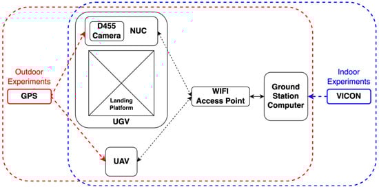 In Figure 8, the framework of the experimental system is demonstrated. The landing platform and UAV are connected through a WIFI access point to the ground station computer, which also acts as the major computational center. This ground station computer is equipped with an Intel I7-10700KF (Intel Corporation, Austin, TX, USA) processor and two NVIDIA RTX 3090 (Nvidia Corporation, Santa Clara, CA, USA) Graphics Processing Units (GPU), ensuring the computational capacity of the system. The flight experiments were first held in an indoor laboratory (blue), which was equipped with a VICON (Vicon Motion Systems, Oxford, UK) motion capture system providing the real-time ground truth information to the ground station computer. Then, the experiments were moved to the outdoors for testing the system in a real-world environment (red). During the outdoor tests, individual GPS modules were placed on both UGV and UAV, such that they could be guided roughly by the GPS coordinates information.