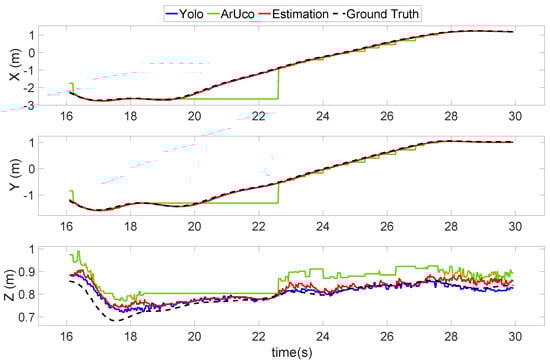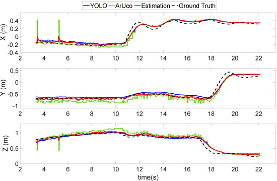 In this section, two flight tests were conducted with the quadrotor UAV in the controlled laboratory for validating the position estimation performance. The first flight test, shown in Figure 9, demonstrated the landing of the quadrotor UAV on the UGV. Figure 9 shows that, at the beginning of the mission, the estimation results from the ArUco (green line) indicated two outliers. When the UAV approached the UGV, the estimation results from both the ArUco and YOLO (blue line) tightly followed the ground truth value (black dashed line). By applying sensor fusion, the estimation results (red line) could precisely follow the ground truth value during the whole experiment.