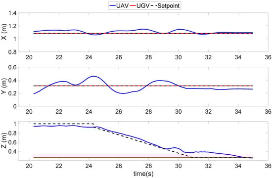 On the contrary, the experiment shown in Figure 12 applied the proposed ground-effect free trajectory. The UAV entered the landing state at an initial position of 1 m from the AGV in the x-direction and 0.25 m in the y-direction. Then, the UAV started to follow the gliding and landing trajectory, which descended in the z-direction while also approaching the AGV in the x- and y-directions. The effectiveness of the ground effect was shown to gradually reduce in the final period. Additionally, the horizontal position performance was also better than the previous results shown in Figure 11.