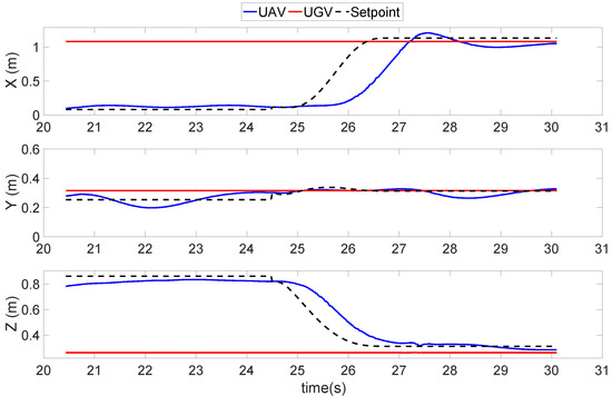Figure 10 shows the second validation flight test, which was a scenario designed for the UAV to follow the landing platform with a large separation. Some unwanted straight horizontal lines are shown in the ArUco state (green line) in Figure 10, especially from 18.5 to 22.5 s. Additionally, its performance in the z-direction was the worst among all directions throughout the entire experiment. These straight horizontal lines indicate that, in these time segments, the ArUco marker on the UAV was not recognized by the vision position detector on the UGV. This was mainly because the ArUco marker was relatively small in the captured image and, as a result, it was difficult for the ArUco algorithm to recognize the marker. Therefore, the ArUco estimation result in this circumstance was unstable and inaccurate.