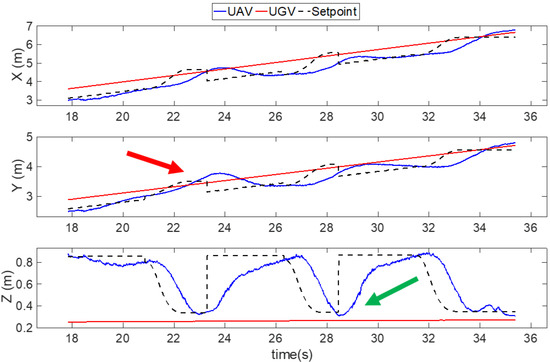 Figure 13 shows that the UAV made three attempts to approach the landing pad, which were at 20.8–23.3 s, 26.3–28.4 s, and 31.5–35 s. In the first attempt, the state machine entered the third stage—ground-effect free trajectory following at 20.8 s. During the approach maneuver (20.8–23.3 s), the positions in the x- and z-directions were well followed with only one second of delay. However, there was an overshoot in the y-direction at 24 s (red arrow), which triggered the failsafe and rewound the state machine to the second stage—vision position following.