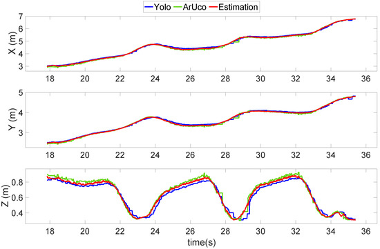 Furthermore, Figure 14 shows the results from the vision system. The figure shows that, particularly during the second approach (27–30 s), in which the UAV was very close to the camera, the YOLO (blue line) started to lose track of the UAV. At the same time, the ArUco was functioning appropriately, which kept the position estimation results on track. Hence, these results show the importance of sensor fusion and redundancy in the vision system.