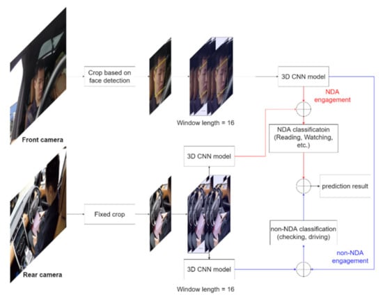 To address the above problem, this paper introduces a 2-feed 3D CNN-based NDA recognition framework, the flowchart of which is shown in Figure 1. This framework is used to recognize 4 types of NDAs and 2 types of driving activities (DAs). The details of these activities will be introduced in the section below. The front camera captures the driver’s head movement, the image of which is cropped based on the face location automatically. A stack of head movement frames within a certain time window, denoted as , are inputted to a 3D CNN model to detect whether the driver is performing NDAs or DAs. The rear camera focuses on the driver hand movement. The frame is fixedly cropped since the hand movement is limited in the vehicle cabin. A stack of hand movement frames within the same time window is imported into 2 separate models to further identify the specific NDA or DA. The final prediction result is obtained from the concatenated results of the NDA and DA classification.